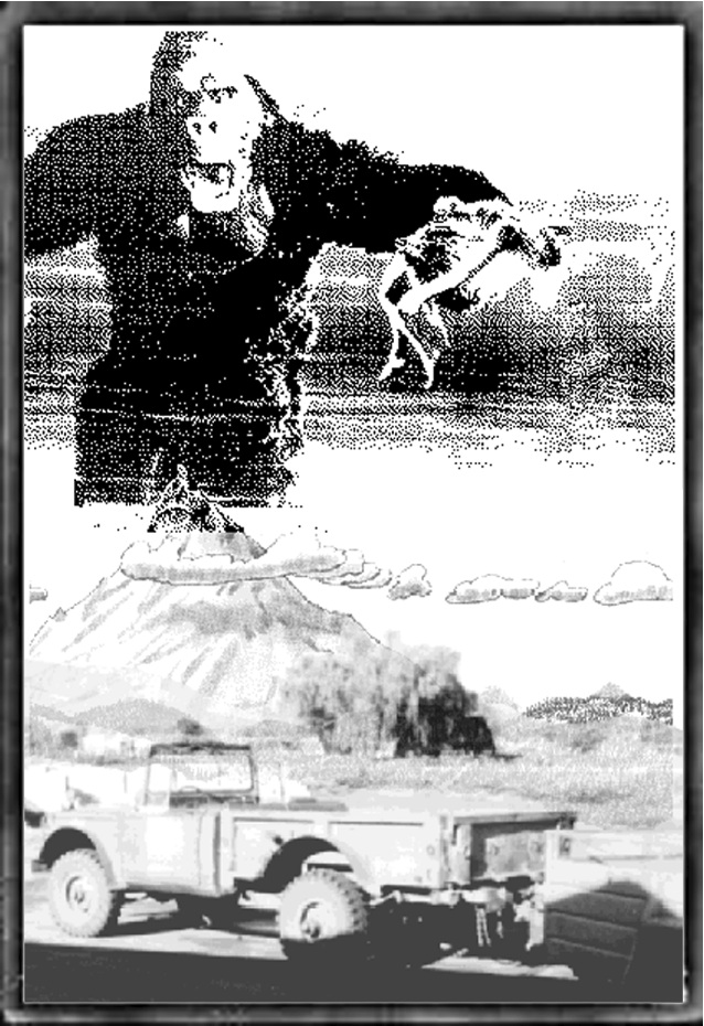 The figure is entitled The Prowess of Kong. It is the end piece of a chapter of that name. Walker makes a trip with a fellow communard to Mt. Shasta to clean up the camp of the sangha. All the while Walker is trying to make up his mind: Should I marry? The image shows King Kong gettin jabbed in the crotch my Mt. Analo (a symbold of the buddhist life), while carying the female. The truck below is a 4 wheel drive 3/4 ton that can go anywhere and is named Kong. The chapter is The Prowess of Kong. Will marriage curtail my sexual prowess?