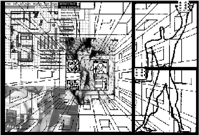 This illustration is for the chapter Urbance. In it Walker writes a cyberpunk story in which he has put several of his friends and his new wife, about a firefight at the 7-11 store in and apocalyptic future in whhich people have powerful inhancements made to their physical body. Walker uses a writer's tool software that he developed. A manual for the software makes up a chapter in the 4th book of the My Years of Apprenticeship at Love entitled Seeing Through the Spell of Transference.