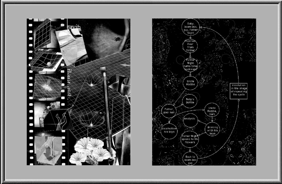 This figure is titled Father Night. It illustrates some of the material in a chapter of that title in the book. The chapter is a theatre piece or when in a book, a "bookmovie". Walker the new father is feeling threatened by some crazy person howling outside at the corner under the street lights. The fear reminds him of his mother being afraid of mororcycle gangs back when he was a child. He is reminded of his own father and poolhalls and drinking problem, and his maternal uncle who Walker emmlated The flow chart or Entity Relationship diagram on the right of the image is reflected in the image on the left which shows frames of a movie and wells in curved space time into which Walker feels himself falling and coming out on the other side. This kind of diagramming is explored heavily in the previous volume of the sextet Seeing Through the Spell of Transference.