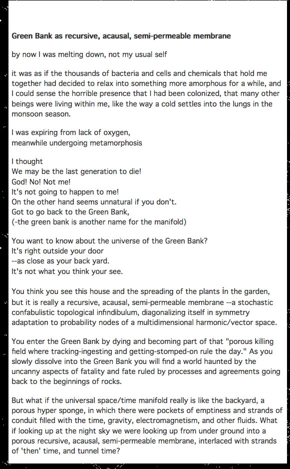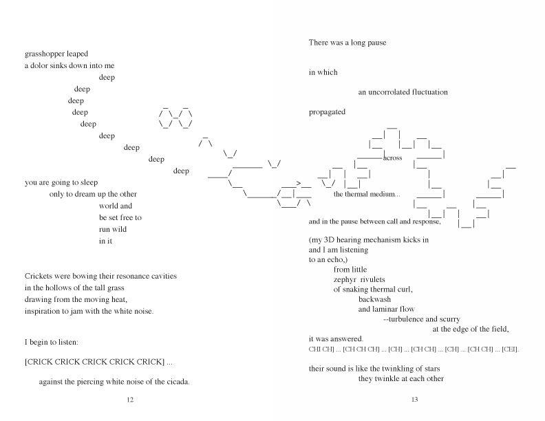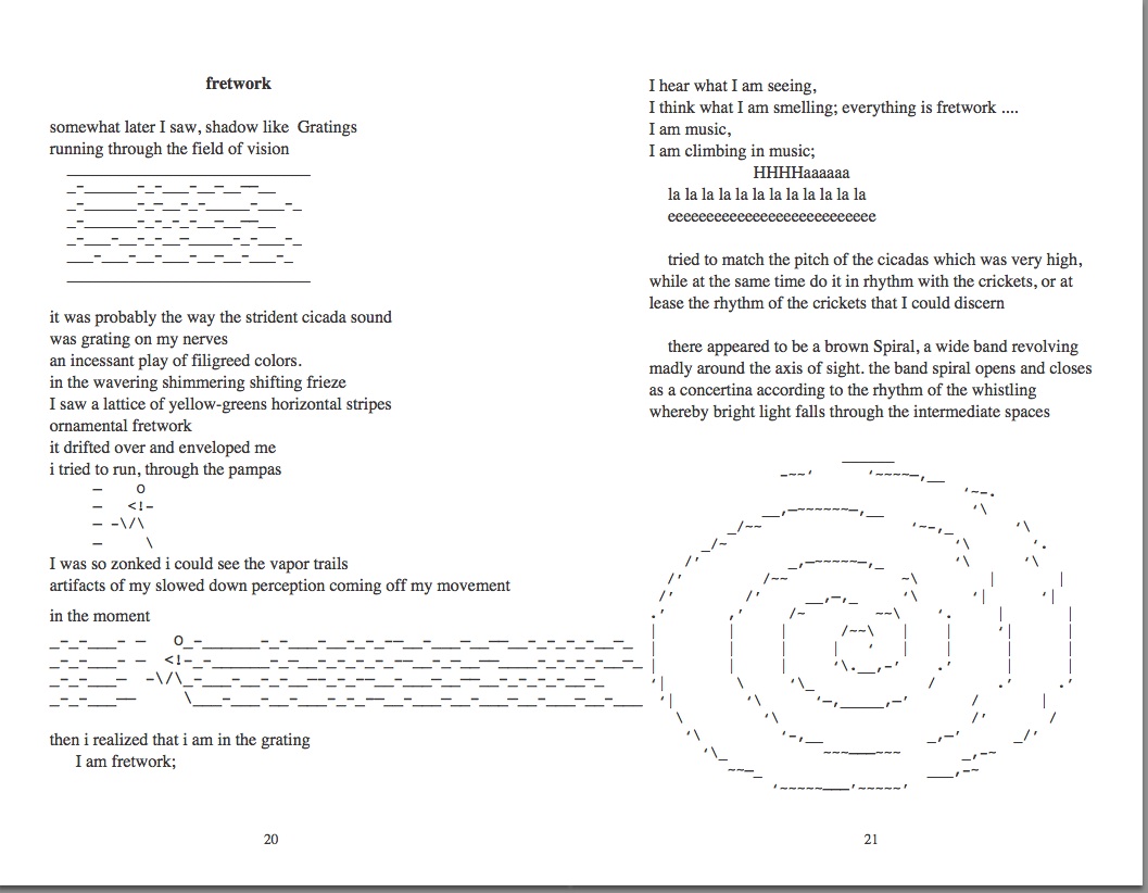 ![]() The Secret of the Cicadas SongA Peyote Trip in Prose and PoetryPaperback: HiT MoteL Press, December 28 1998, 1st Edtion Buy the paperback on Amazon or Barnes & Noble. See the other books in this sextet HiT Motel Press. SummaryThe Secret of the Cicadas Song is an expanded chapter from the novel Cultivating the Texas Twister Hybrid. As such it becomes volume 2 in what is called The Little House on the Prairie trilogy. In this epic poem, a man who is both a physicist and a poet is walking in the landscape as we hear the an extended internal monolog of his observations. Although most of the book is written in English language, some of the book is in a kind of syntactic repetition curved into a movement, some of it draws movement in punctuation, it can be read aloud. Some is mathematical symbols which can be spoken, and should be read aloud as a kind of incantation of the abstract vision they invoke. Table of ContentsPart 1 Hyperspectral / The Dirac Satori I seem to be a fractal in the Green Bank 78 relativity 79 leaf feather 91 Green Bank parade 92 Green Bank as recursive, acausal, semi-permeable membrane 93 a bit of a bummer 95 she, Gaia, when 102 Oxygen 10 the floating brain, 106 Mushrooms 107 The DNA computer 109 where does language begin / the real name of water 113 Green Bank formula 121 Green Bank Definition 125 the heart is a strange attractor 126 The Background Hiss of Summer 130 Writing Notes forThe Secret of the Cicadas Song from the AuthorI majored in physics in college, and my favorite was thermodynamics which did a good job of presenting reality as a macrosphere floating over a microsphere governed by the rules ot probability formulated into Statistical Mechanics. It was about the motions of all kinds of fluids, the watercourse way —in the abstract: vectors in a field. As a physics student I had spent a lot of time studying math, though I wasn’t really that good at it, I learned it like one might learn a foreign language. It was a non-indo european language in which one combined symbols and operators that allowed one to perceive what happened to objects in space and time, but more underneath the behavior changing in space and time. Differential equations which describe all behavior of change unfolding in time, was a kind of western enlightenment, once you spent a bunch of time working at it. In the first image below<link>, starting with “Along with my fiery guid dog Blake” you see I am working with three elements: the rising and falling sinusoidal of the ei the cicada chorus, this leads to a spiral out there. The ei is the exponential function, with the imaginary number “i”, making a rising and falling envelope. There is a kind of notation developing, words as objects. The phrase “rock drill” is an allusion to Pound, suggesting a technician of the sacred getting down to work on a hard subject. The green wind is an allusion to Lorca, leading to the crickets. Also “green ideas sleep furiously” deep; grammar. Also the green pallor of the face sets in, as blood is draw away, queasiness of existential nausea is starting, if you throw up now it will be green. After a couple of poems, one in which the narrator imagines himself dying from snake bite and another in which he imagines himself being looked at from the compound eye of an insect, we come to this passage in which he tunes into the crickets communicating with each other. These passages are stanzas or choruses of the poem. This one with the gesture down <link grasshopper leaped> is like a haiku ukiyo-e paintings of words. A much deeper sense of existence is settling in. The poem talks about a kind of resolve settling in, you are on the trip now, got to go with it. Besides Dirac, Rene Thom, as well as soon Prigogene are imprinting themselves on the poem. The eyes looking in poem notation of the words mimic the movement of the eye. an actualist at work. One generative hypothesis of the poem is: What would happen if Ezra Pound and Charles Dodson collaborated about being influenced by Basho and Dirac. In the stanza below "peyoteros must change the names of things" in which the poet tries to learn the real names of things. It gives the story of our sun and planet earth. as a couple a father and mother. daughters a history of a the world with spritis coursing through it. water fire wind The language in The Secret of the Cicadas Song becomes more than simple words and syntax. The poem blows syntax out into spatial traces, the words become objects, the meanings speak to a trans-culture literacy. I am trying to always bridge the supposed gap between art and science. Language becomes how ideas circulating around in the noosphere take up station in the consideration of minds prepared to receive them. Natured is imagined through the symbols, signs and operations of the space time language and seen to be communicating at all levels with aspects of itself.
