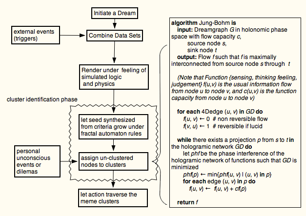 For This is a Entity Relationship Model for how associations and archetypes get into the dream, how the Dream Dramaturge composes a part of the dream. It suggest the idea in the Jung-Bohm algorighm pseudocode a 4 dimensional world, the tesseract being traaversed is isomorphic to a holonomic phase space in whi the composer gets assent entities.