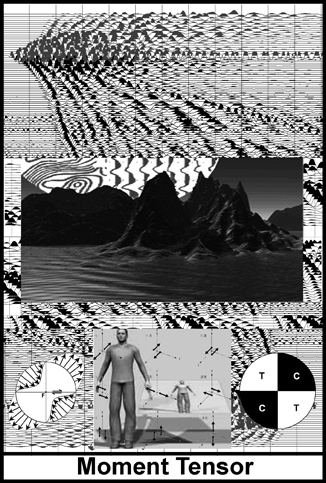 In the image at right you have various charts of seismic wave behavior fanning out in 3D. The landscape of cragy fjords and water waves suggest that land is waves in long geological time. The standing man in the center is shown warped by forces behind him. On each side are "beachball" representations of the symmetry of tension and compression forces of the seismic waves through landscape.